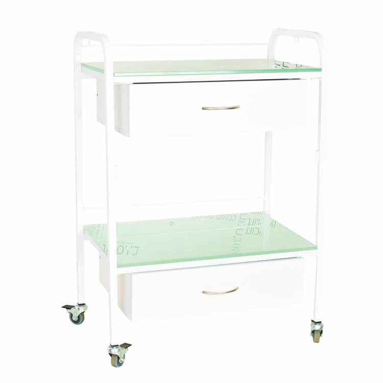 עגלת קוסמטיקה 2 מדפי זכוכית עם 2 מגירת עץ עגלת קוסמטיקה שיש בה את כל מה שצריך על מנת לבצע כל טיפול בנוחות מרבית. המדפים מרווחים דיים ומאפשרים לאחסן עליהם מגוון רחב של מוצרים, לרבות כל סוגי מכשירים קוסמטים,אמבט לשעווה חמה, רצועות להסרת שיער ושאר מוצרים. העגלה ניתנת לניוד בקלות רבה בזכות ארבעת הגלגלי סיליקון עם מעצורים המוצבים בתחתיתה, כבל מעריך עם מפצל לשלוש חיבורים של מוצרי חשמל,נקודות התקנת ללופה בשני צדדי העגלה המאפשרים לקוסמטיקאית לעבוד בנוחות מלאה.המגירות עץ רחבות ועמוקות מאפשרות לאחסן בהן מוצרים עודפים או כאלה שלא כדאי שיהיו במקום פתוח, ואין בכלל ספק שהעגלה משפרת מאוד את יעילות הטיפול ואת נוחות העבודה. מידות: גובה 92, רוחב 40, אורך60